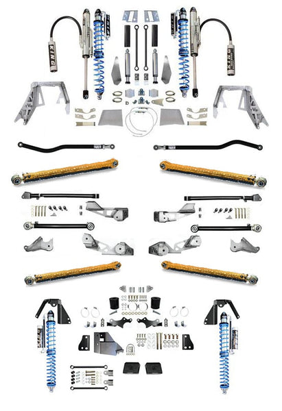 EVO MFG JLU DTD Pro Suspension System comes with replacement heavy duty control arms and front/rear trackbars that offer adjustability and strength over the factory parts.