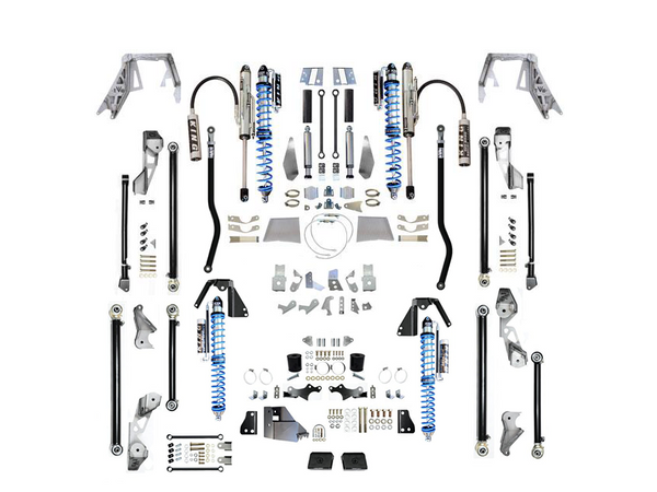 Kit includes heavy-duty control arms and adjustable front/rear trackbars for superior strength over factory components.